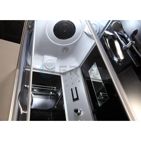 Душевой шланг, Душевая лейка, Держатель для душевой лейки, Полочка, Ручки, Подсветка, Верхний душ, Подсветка “Лунный свет”, Поддон, Радио, Смеситель, Сифон, Штанга душевая, Зеркало