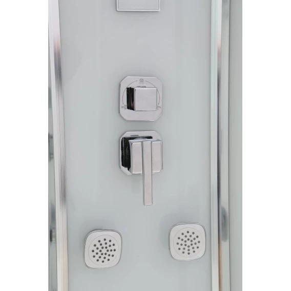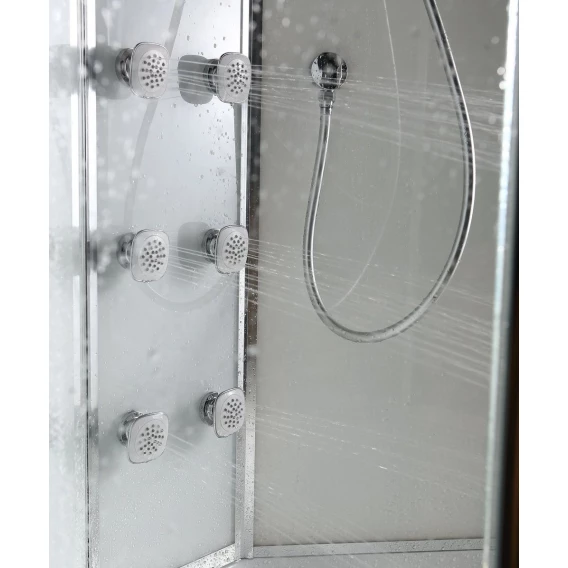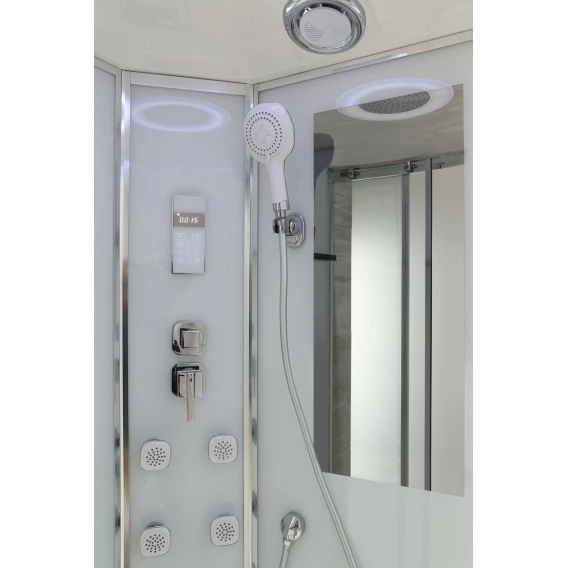 Душевой шланг, Душевая лейка, Держатель для душевой лейки, Подключение для душевого шланга, Полочка, Ручки, LED подсветка, Верхний душ, Bluetooth, Металлический каркас, Поддон, Радио, Смеситель, Сифон, Ножки, Зеркало
