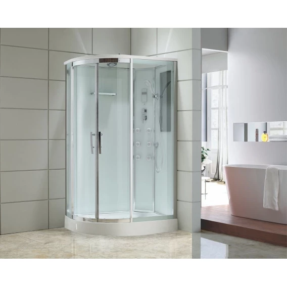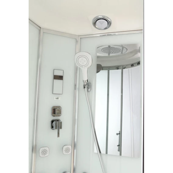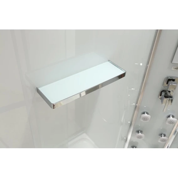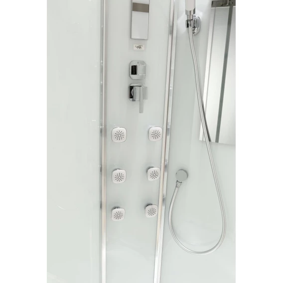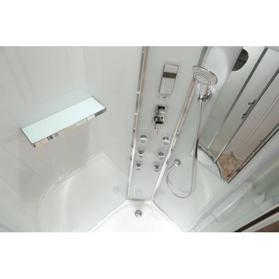 Душевой шланг, Душевая лейка, Держатель для душевой лейки, Подключение для душевого шланга, Полочка, Ручки, LED подсветка, Верхний душ, Bluetooth, Металлический каркас, Поддон, Радио, Смеситель, Сифон, Ножки, Зеркало
