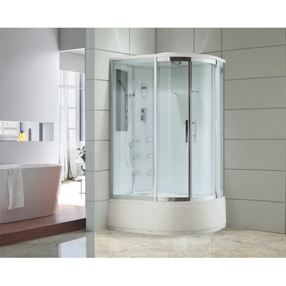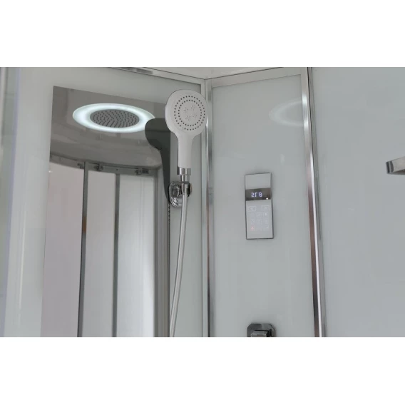 Душевой шланг, Душевая лейка, Держатель для душевой лейки, Подключение для душевого шланга, Полочка, Ручки, LED подсветка, Верхний душ, Bluetooth, Металлический каркас, Поддон, Сиденье, Радио, Смеситель, Сифон, Ножки, Зеркало