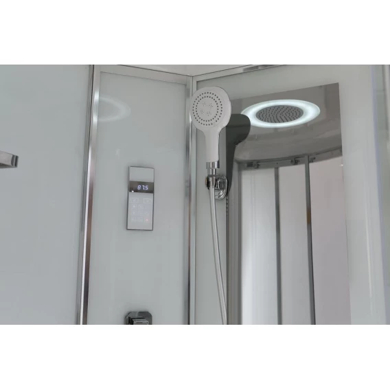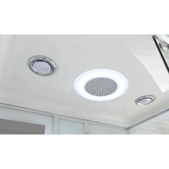 Душевой шланг, Душевая лейка, Держатель для душевой лейки, Подключение для душевого шланга, Полочка, Ручки, LED подсветка, Верхний душ, Bluetooth, Металлический каркас, Поддон, Сиденье, Радио, Смеситель, Сифон, Ножки, Зеркало