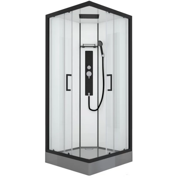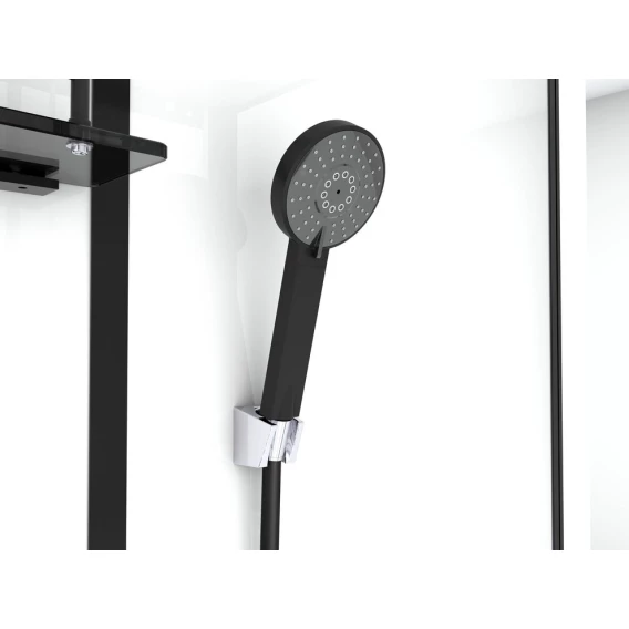 Душевой шланг, Душевая лейка, Держатель для душевой лейки, Подключение для душевого шланга, Полочка, Ручки, Верхний душ, Металлический каркас, Поддон, Смеситель, Сифон, Ножки