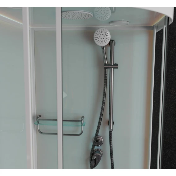 Душевой шланг, Душевая лейка, Держатель для душевой лейки, Подключение для душевого шланга, Полочка, Ручки, Верхний душ, Металлический каркас, Поддон, Смеситель, Сифон, Штанга душевая, Ножки