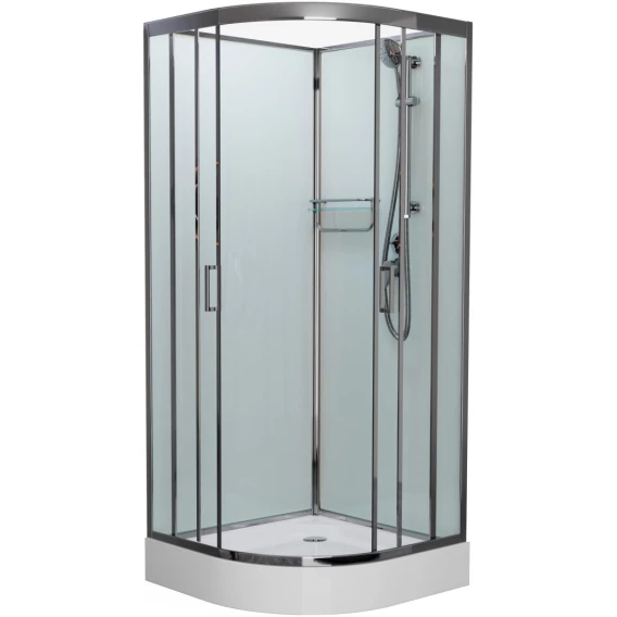 Душевой шланг, Душевая лейка, Держатель для душевой лейки, Подключение для душевого шланга, Полочка, Ручки, Металлический каркас, Поддон, Смеситель, Сифон, Штанга душевая, Ножки, Зеркало