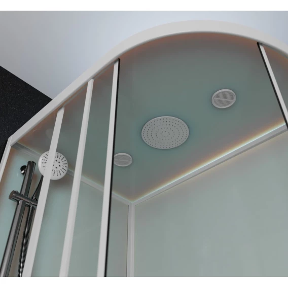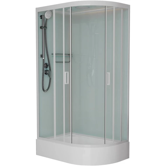 Душевой шланг, Душевая лейка, Держатель для душевой лейки, Подключение для душевого шланга, Полочка, Ручки, Верхний душ, Металлический каркас, Поддон, Смеситель, Сифон, Штанга душевая, Ножки