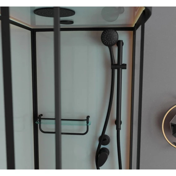 Душевой шланг, Душевая лейка, Держатель для душевой лейки, Подключение для душевого шланга, Полочка, Ручки, Верхний душ, Металлический каркас, Поддон, Смеситель, Сифон, Штанга душевая, Ножки