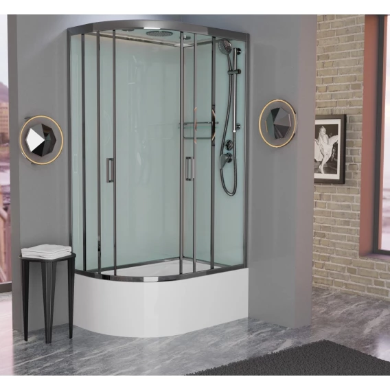 Душевой шланг, Душевая лейка, Держатель для душевой лейки, Подключение для душевого шланга, Полочка, Ручки, Верхний душ, Металлический каркас, Поддон, Сиденье, Смеситель, Сифон, Штанга душевая, Ножки