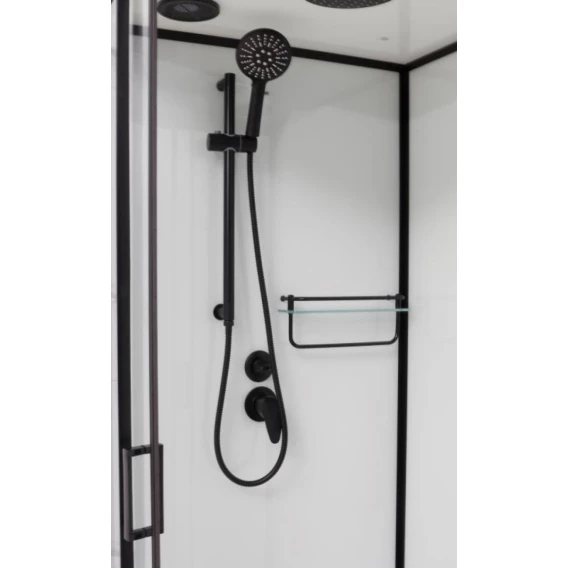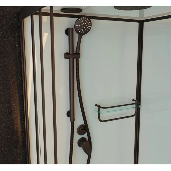 Душевой шланг, Душевая лейка, Держатель для душевой лейки, Подключение для душевого шланга, Полочка, Ручки, Верхний душ, Металлический каркас, Поддон, Смеситель, Сифон, Штанга душевая, Ножки