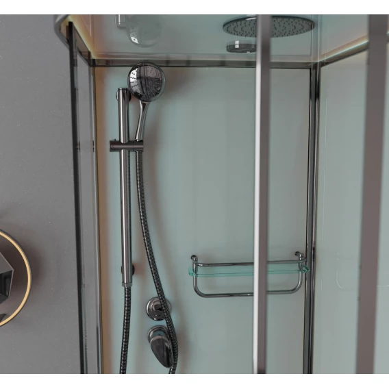 Душевой шланг, Душевая лейка, Держатель для душевой лейки, Подключение для душевого шланга, Полочка, Ручки, Верхний душ, Металлический каркас, Поддон, Смеситель, Сифон, Штанга душевая, Ножки