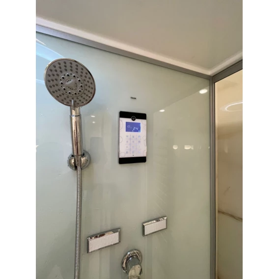 Душевой шланг, Душевая лейка, Держатель для душевой лейки, Подключение для душевого шланга, Полочка, Ручки, Подсветка, Верхний душ, Металлический каркас, Поддон, Радио, Смеситель, Сифон, Ножки