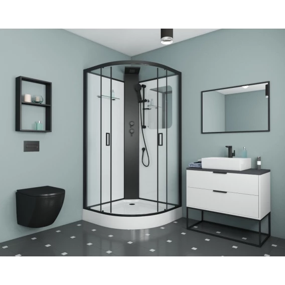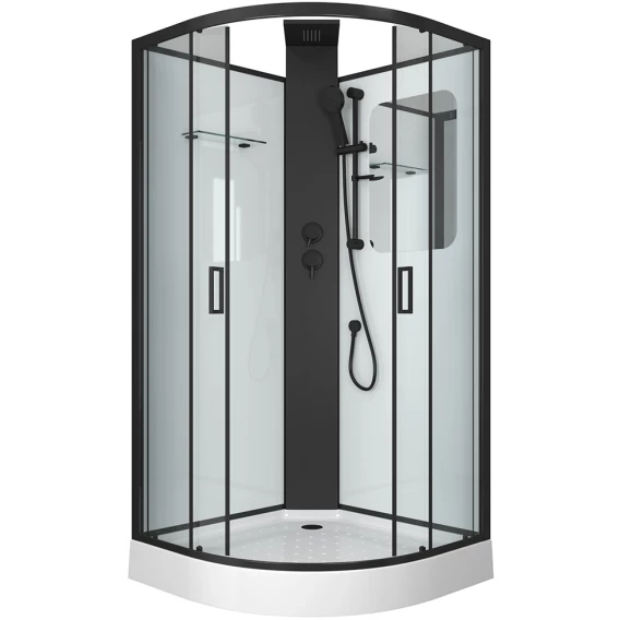 Душевой шланг, Душевая лейка, Держатель для душевой лейки, Подключение для душевого шланга, Полочка, Верхний душ, Поддон, Смеситель, Сифон, Мыльница, Штанга душевая, Ножки, Зеркало