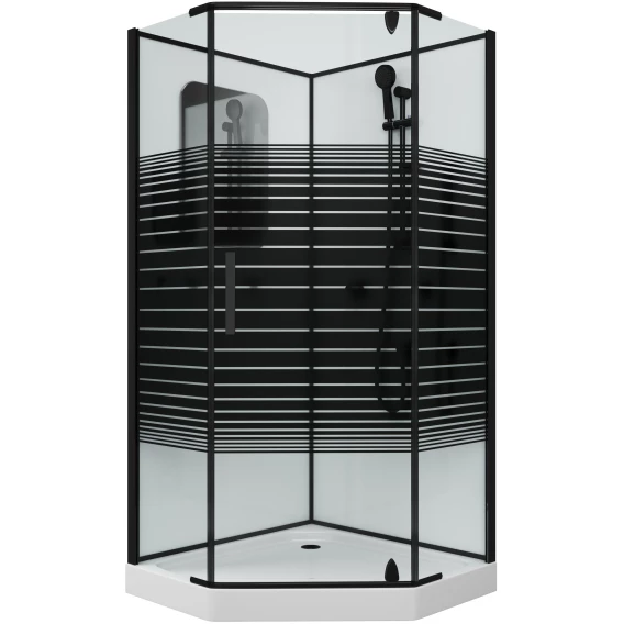 Душевой шланг, Душевая лейка, Держатель для душевой лейки, Подключение для душевого шланга, Полочка, Поддон, Смеситель, Сифон, Мыльница, Штанга душевая, Ножки, Зеркало