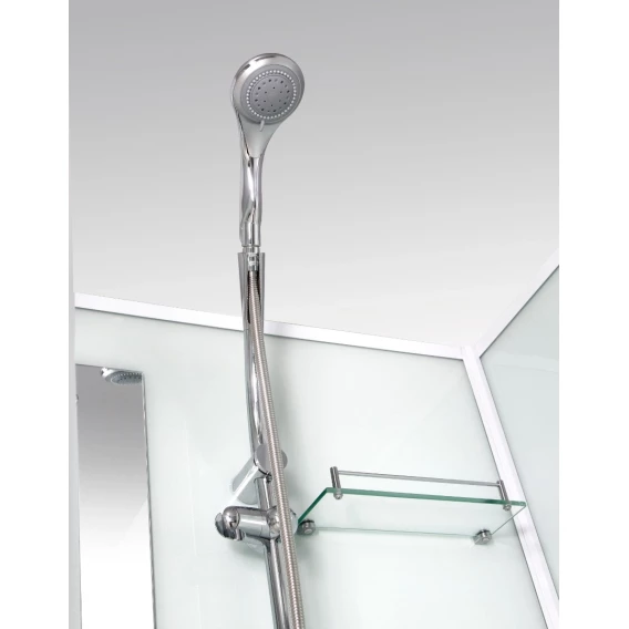 Душевой шланг, Душевая лейка, Держатель для душевой лейки, Полочка, Металлический каркас, Поддон, Смеситель, Сифон, Штанга душевая, Ножки, Зеркало