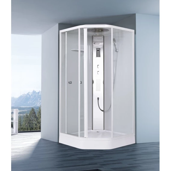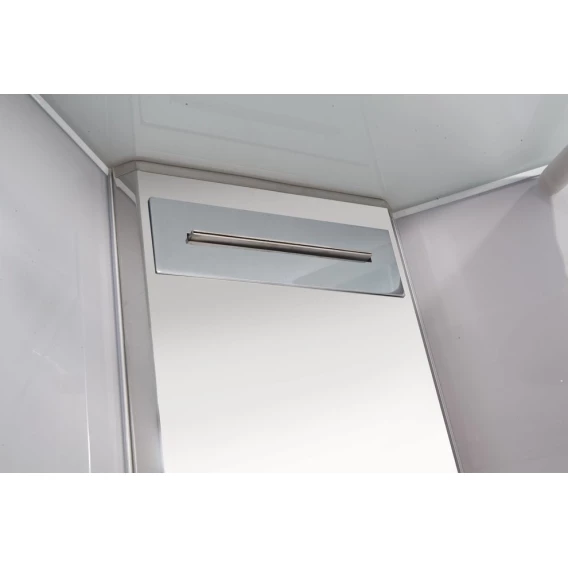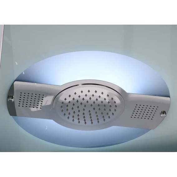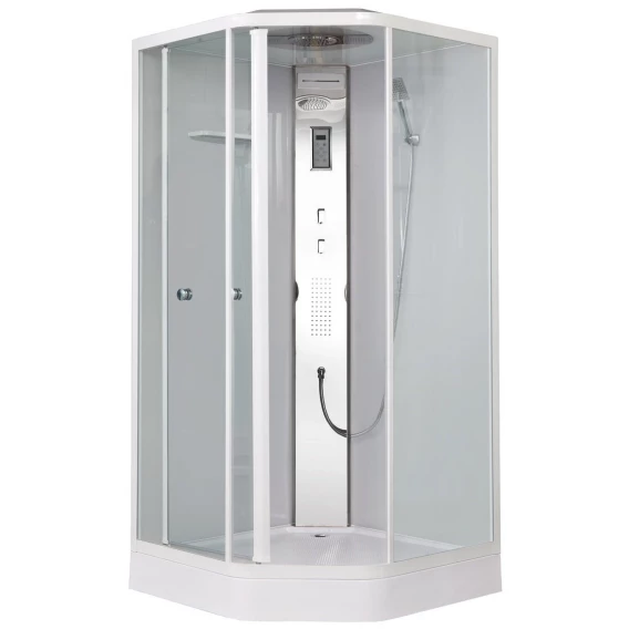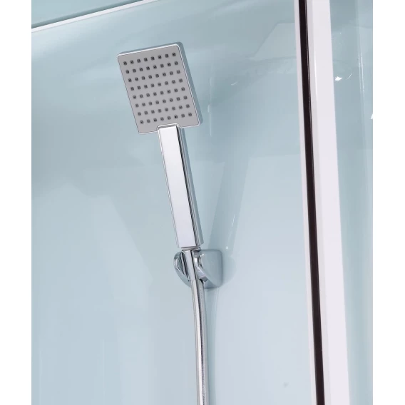 Душевой шланг, Душевая лейка, Держатель для душевой лейки, Подключение для душевого шланга, Полочка, Ручки, LED подсветка, Верхний душ, Динамик, Металлический каркас, Поддон, Радио, Смеситель, Сифон, Ножки