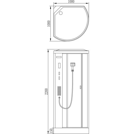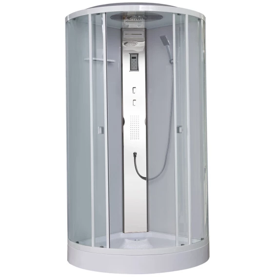 Душевой шланг, Душевая лейка, Держатель для душевой лейки, Подключение для душевого шланга, Полочка, Ручки, LED подсветка, Верхний душ, Динамик, Металлический каркас, Поддон, Радио, Смеситель, Сифон, Ножки