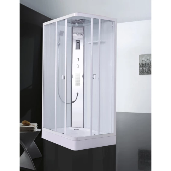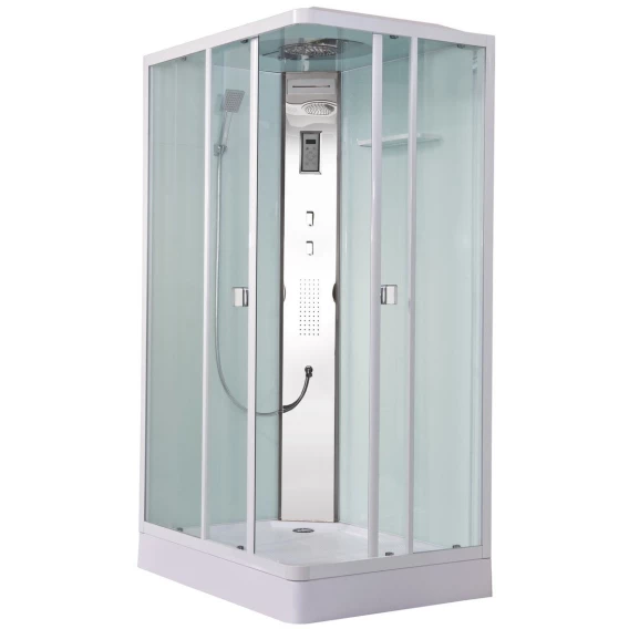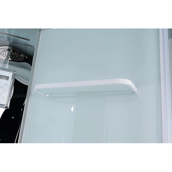 Душевой шланг, Душевая лейка, Держатель для душевой лейки, Подключение для душевого шланга, Полочка, Ручки, LED подсветка, Верхний душ, Динамик, Металлический каркас, Поддон, Радио, Смеситель, Сифон, Ножки