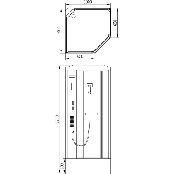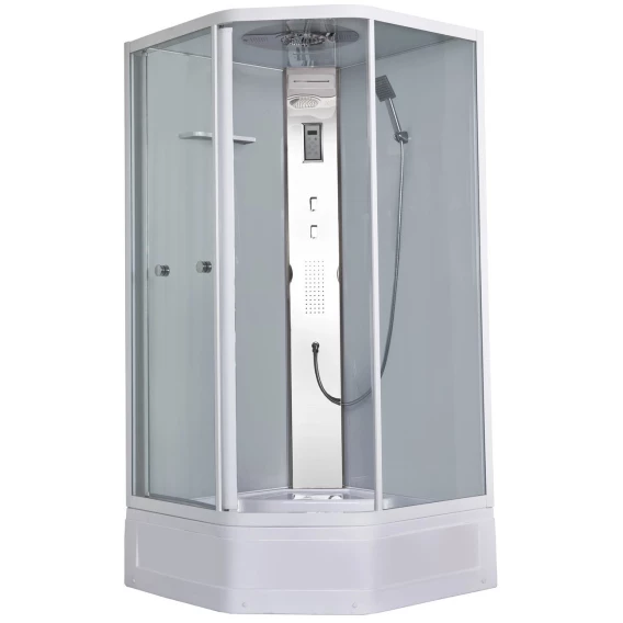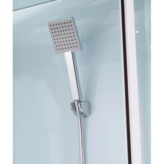 Душевой шланг, Душевая лейка, Держатель для душевой лейки, Подключение для душевого шланга, Полочка, Ручки, LED подсветка, Верхний душ, Динамик, Металлический каркас, Поддон, Радио, Смеситель, Сифон, Ножки