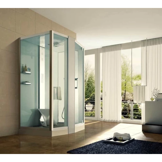 Душевой шланг, Душевая лейка, Подключение для душевого шланга с держателем, Полочка, LED подсветка, Верхний душ, Металлический каркас, Ручка, Поддон, Сиденье, Радио, Полотенцедержатель, Смеситель, Сифон, Ножки