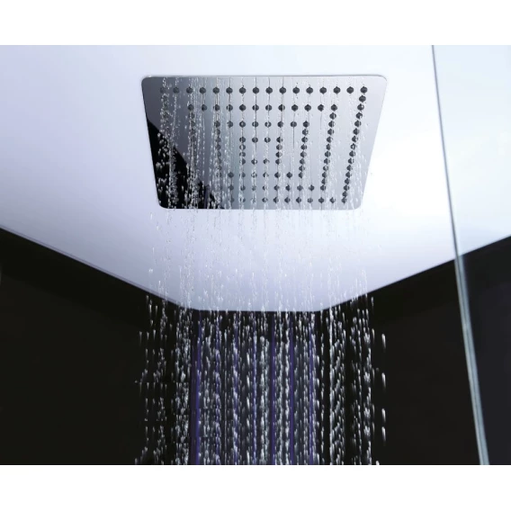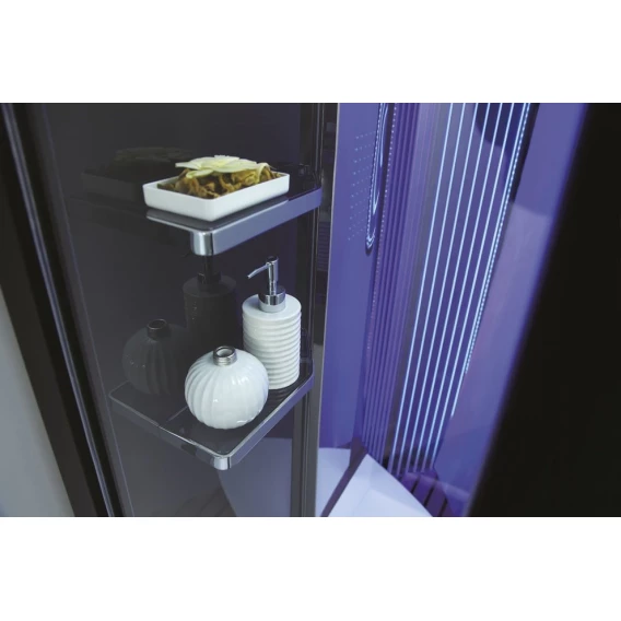 Душевой шланг, Душевая лейка, Подключение для душевого шланга с держателем, Полочка, LED подсветка, Верхний душ, Металлический каркас, Ручка, Поддон, Сиденье, Радио, Полотенцедержатель, Смеситель, Сифон, Ножки