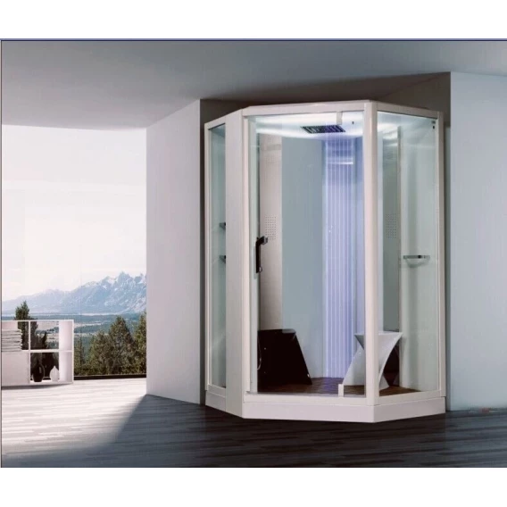 Душевой шланг, Душевая лейка, Подключение для душевого шланга с держателем, Полочка, LED подсветка, Верхний душ, Металлический каркас, Ручка, Поддон, Сиденье, Радио, Полотенцедержатель, Смеситель, Сифон, Ножки