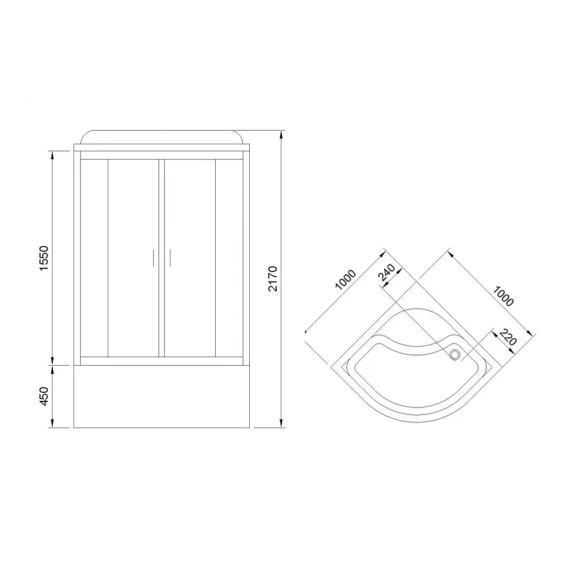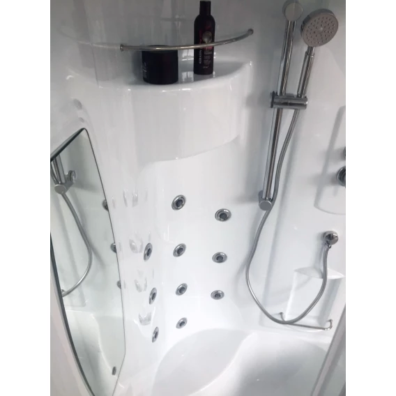 Душевой шланг, Душевая лейка, Держатель для душевой лейки, Подключение для душевого шланга, Полочка, Ручки, Верхний душ, Поддон, Сиденье, Смеситель, Сифон, Штанга душевая, Ножки, Зеркало