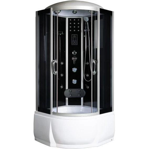 Душевой шланг, Душевая лейка, Держатель для душевой лейки, Полочка, Верхний душ, Подсветка “Лунный свет”, Поддон, Телефон, Радио, Излив, Смеситель, Сифон, Штанга душевая, Зеркало