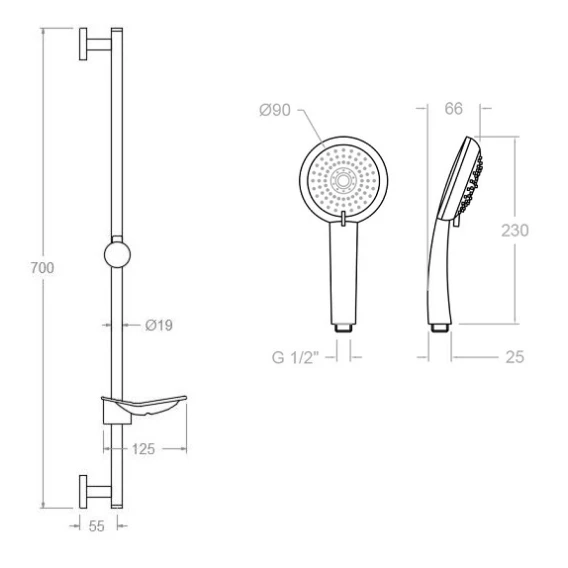 Крепление, Душевой шланг, Душевая лейка, Держатель для душевой лейки, Мыльница, Штанга душевая