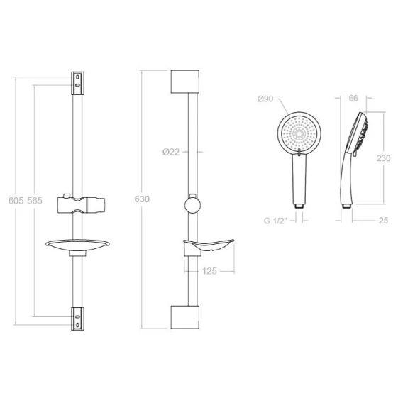 Крепление, Душевой шланг, Душевая лейка, Держатель для душевой лейки, Мыльница, Штанга душевая