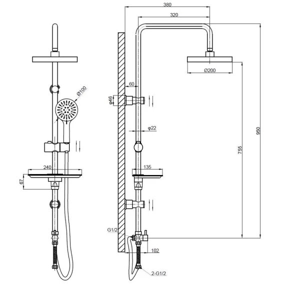Душевой шланг, Душевая лейка, Держатель для душевой лейки, Полочка, Верхний душ, Кронштейн, Штанга душевая