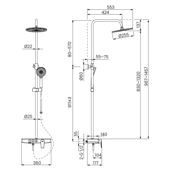 Аэратор, Эксцентрики, Душевой шланг, Душевая лейка, Держатель для душевой лейки, Полочка, Верхний душ, Смеситель, Кронштейн, Штанга душевая