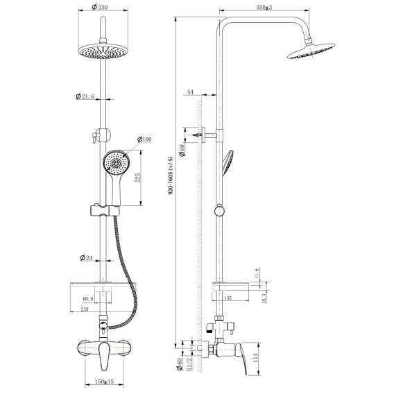 Металлическая розетка, Эксцентрики, Душевой шланг, Душевая лейка, Держатель для душевой лейки, Полочка, Верхний душ, Смеситель, Кронштейн, Штанга душевая
