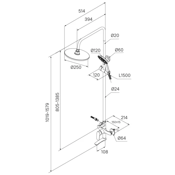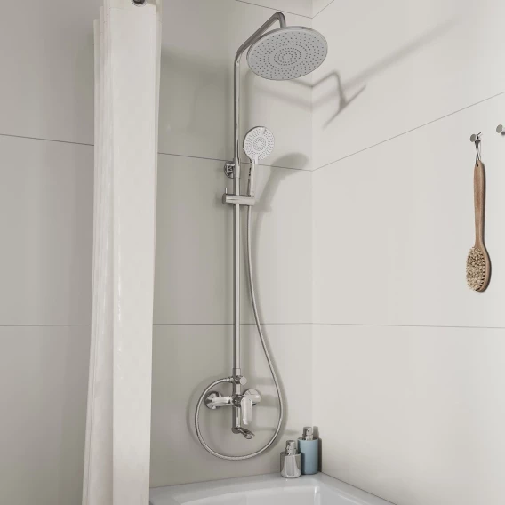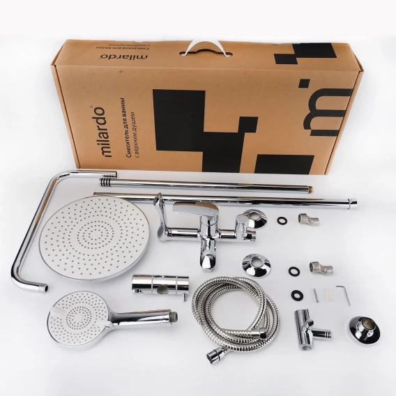 Металлическая розетка, Эксцентрики, Душевой шланг, Душевая лейка, Держатель для душевой лейки, Верхний душ, Смеситель, Кронштейн, Штанга душевая