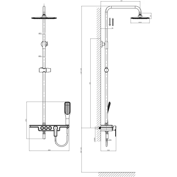 Аэратор, Металлическая розетка, Эксцентрики, Душевой шланг, Душевая лейка, Держатель для душевой лейки, Полочка, Верхний душ, Смеситель, Кронштейн, Штанга душевая