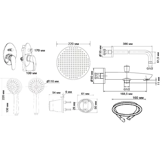 Аэратор, Душевой шланг, Душевая лейка, Подключение для душевого шланга с держателем, Верхний душ, Излив, Скрытая монтажная часть, Смеситель, Кронштейн
