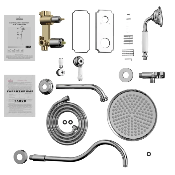 Душевой шланг, Душевая лейка, Подключение для душевого шланга с держателем, Верхний душ, Скрытая монтажная часть, Смеситель, Кронштейн