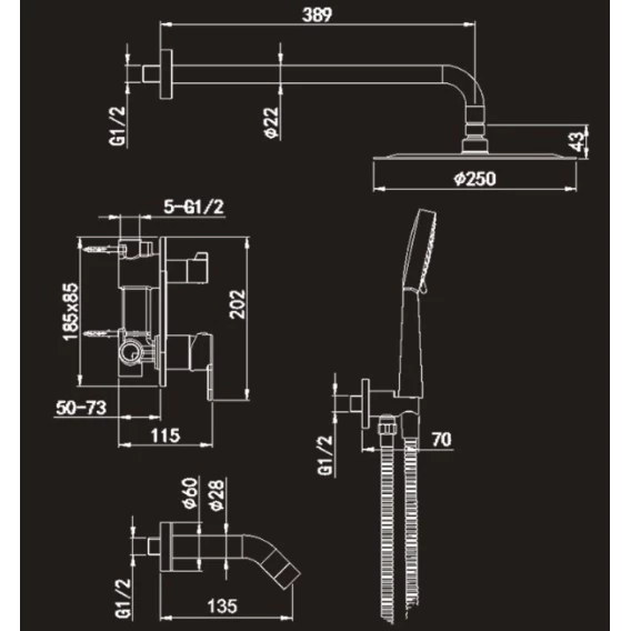 Аэратор, Душевой шланг, Душевая лейка, Подключение для душевого шланга с держателем, Верхний душ, Излив, Скрытая монтажная часть, Смеситель, Кронштейн