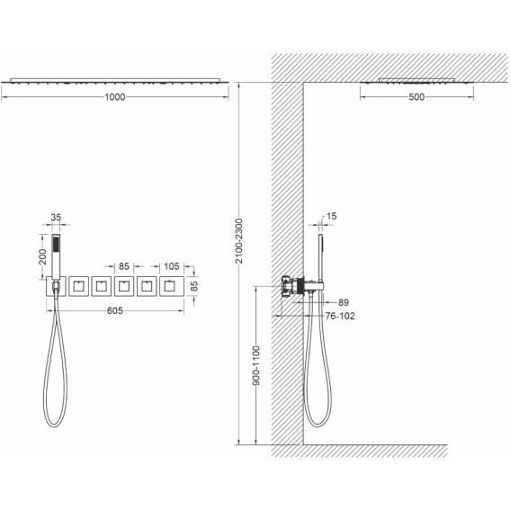 Душевой шланг, Душевая лейка, Подключение для душевого шланга с держателем, Верхний душ, Скрытая монтажная часть, Термостат