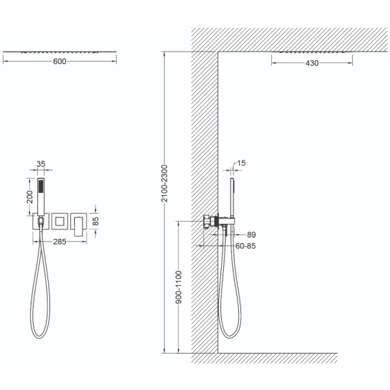 Душевой шланг, Душевая лейка, Подключение для душевого шланга с держателем, Верхний душ, Скрытая монтажная часть, Смеситель
