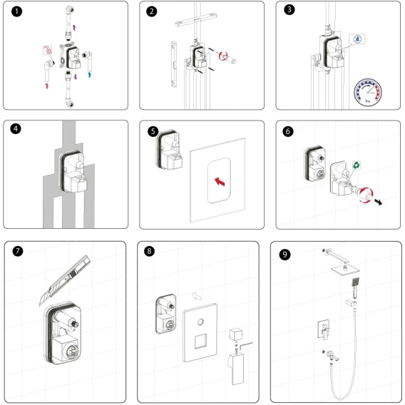 Аэратор, Душевой шланг, Душевая лейка, Держатель для душевой лейки, Подключение для душевого шланга, Верхний душ, Излив, Скрытая монтажная часть, Смеситель, Кронштейн