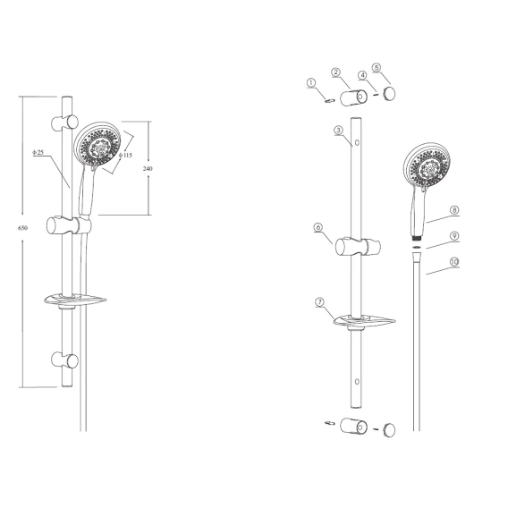 Душевой шланг, Душевая лейка, Держатель для душевой лейки, Мыльница, Штанга душевая