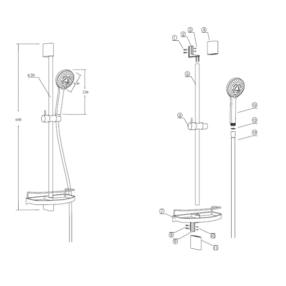 Душевой шланг, Душевая лейка, Держатель для душевой лейки, Полочка, Штанга душевая