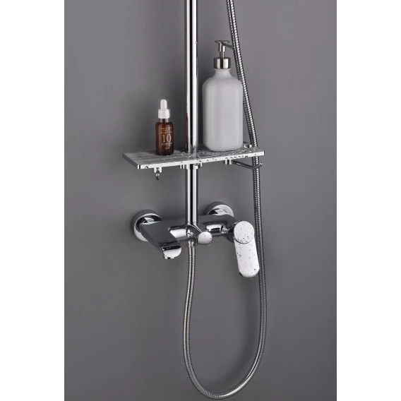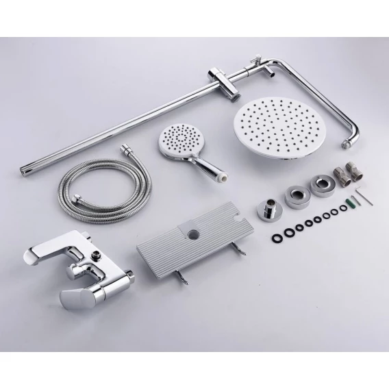 Аэратор, Металлическая розетка, Эксцентрики, Душевой шланг, Душевая лейка, Держатель для душевой лейки, Полочка, Верхний душ, Смеситель, Кронштейн, Штанга душевая
