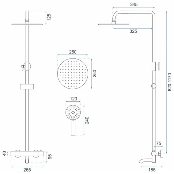 Аэратор, Металлическая розетка, Эксцентрики, Душевой шланг, Душевая лейка, Держатель для душевой лейки, Верхний душ, Кронштейн, Штанга душевая, Термостат