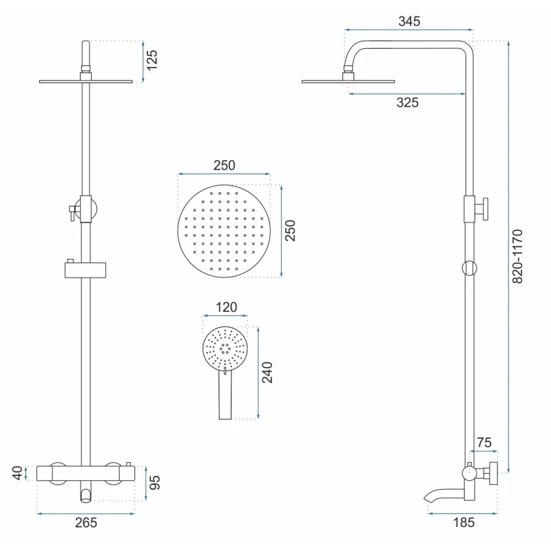 Аэратор, Металлическая розетка, Эксцентрики, Душевой шланг, Душевая лейка, Держатель для душевой лейки, Верхний душ, Кронштейн, Штанга душевая, Термостат