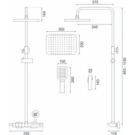 Аэратор, Металлическая розетка, Эксцентрики, Душевой шланг, Душевая лейка, Держатель для душевой лейки, Верхний душ, Кронштейн, Штанга душевая, Термостат