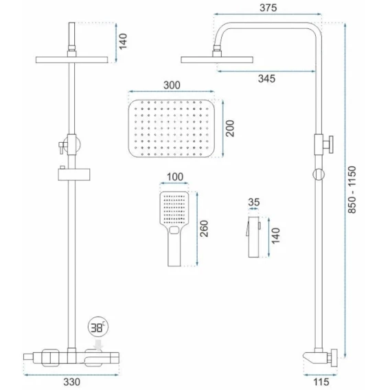 Аэратор, Металлическая розетка, Эксцентрики, Душевой шланг, Душевая лейка, Держатель для душевой лейки, Верхний душ, Кронштейн, Штанга душевая, Термостат