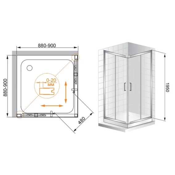 • Габариты с диапазоном регулировок, мм: (990-1015)х(990-1015)х1950