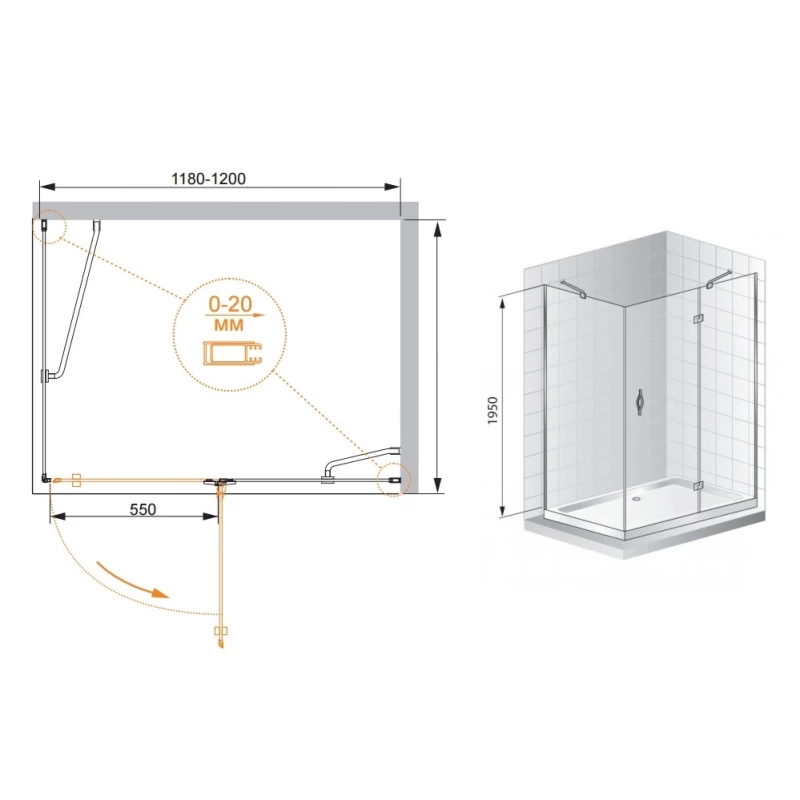 • Габариты с диапазоном регулировок, мм: (1180-1200)x(780-800)x1950