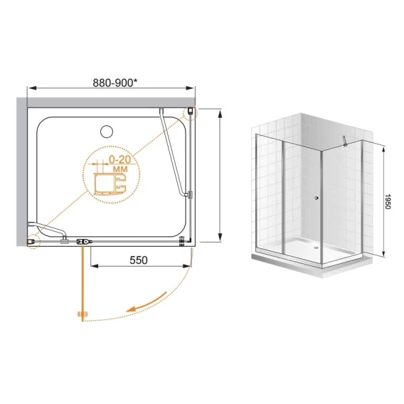 • Габариты с диапазоном регулировок, мм: (880-900)x(980-1000)x1950