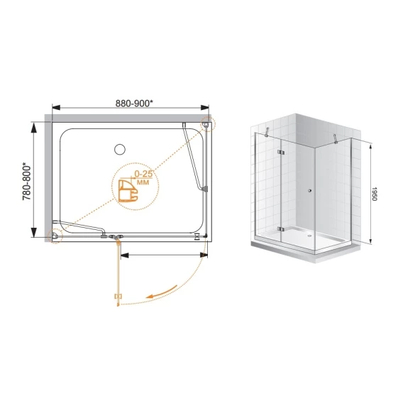 • Габариты с диапазоном регулировок, мм: (880-900)x(780-800)x1950